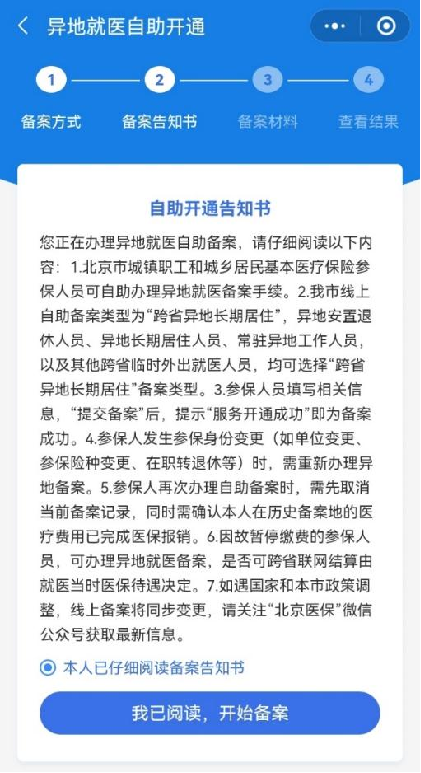 仔細閱讀備案告知書,選中【本人已仔細閱讀備案告知書】,點擊【我已閱讀,開始備案】按鈕。