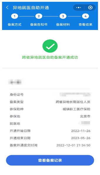 備案信息提交后,自動彈出提示頁,提示備案是否成功,點擊【查看備案記錄】按鈕,可查詢異地就醫備案狀態。備案成功后,即時生效。